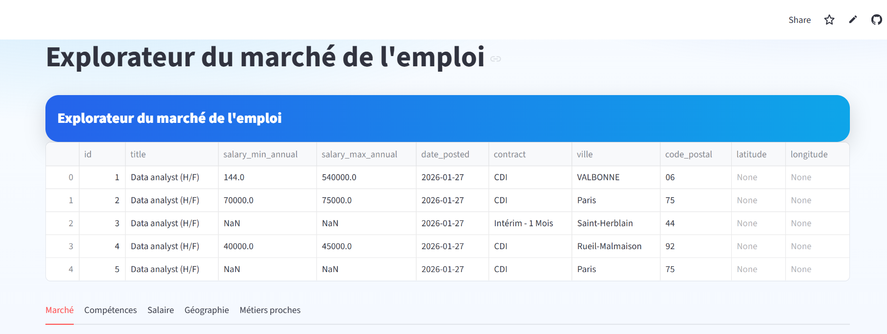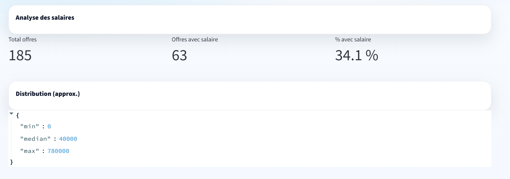 Cet onglet permet de répondre à la question : « Quels niveaux de salaire minimum et maximum apparaissent dans les offres, afin de préparer les échanges avec les recruteurs ? »