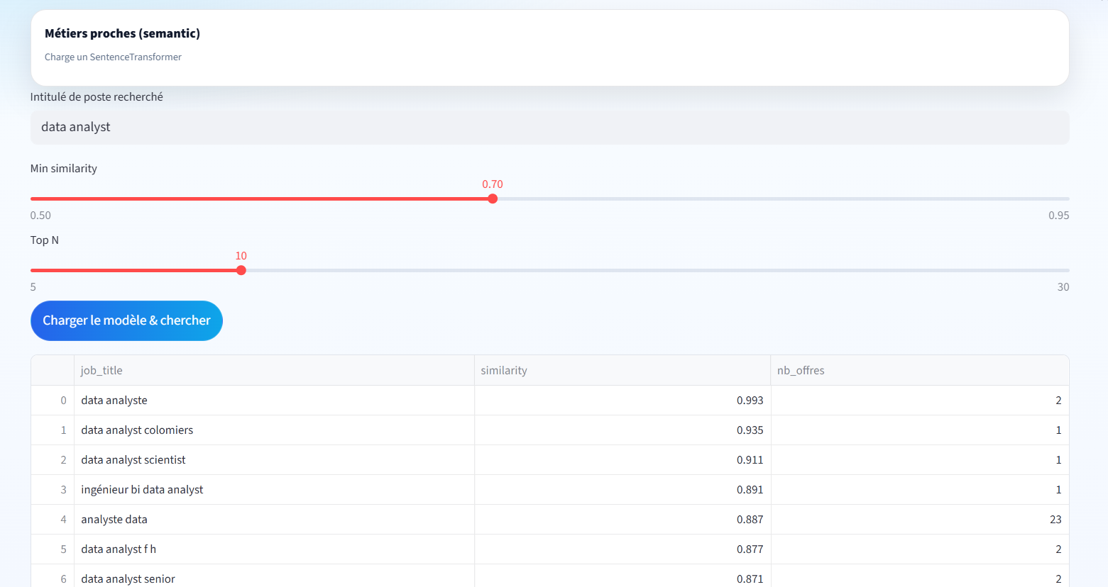 Pour chaque métier proche : - score de similarité sémantique, - nombre d’offres associées.