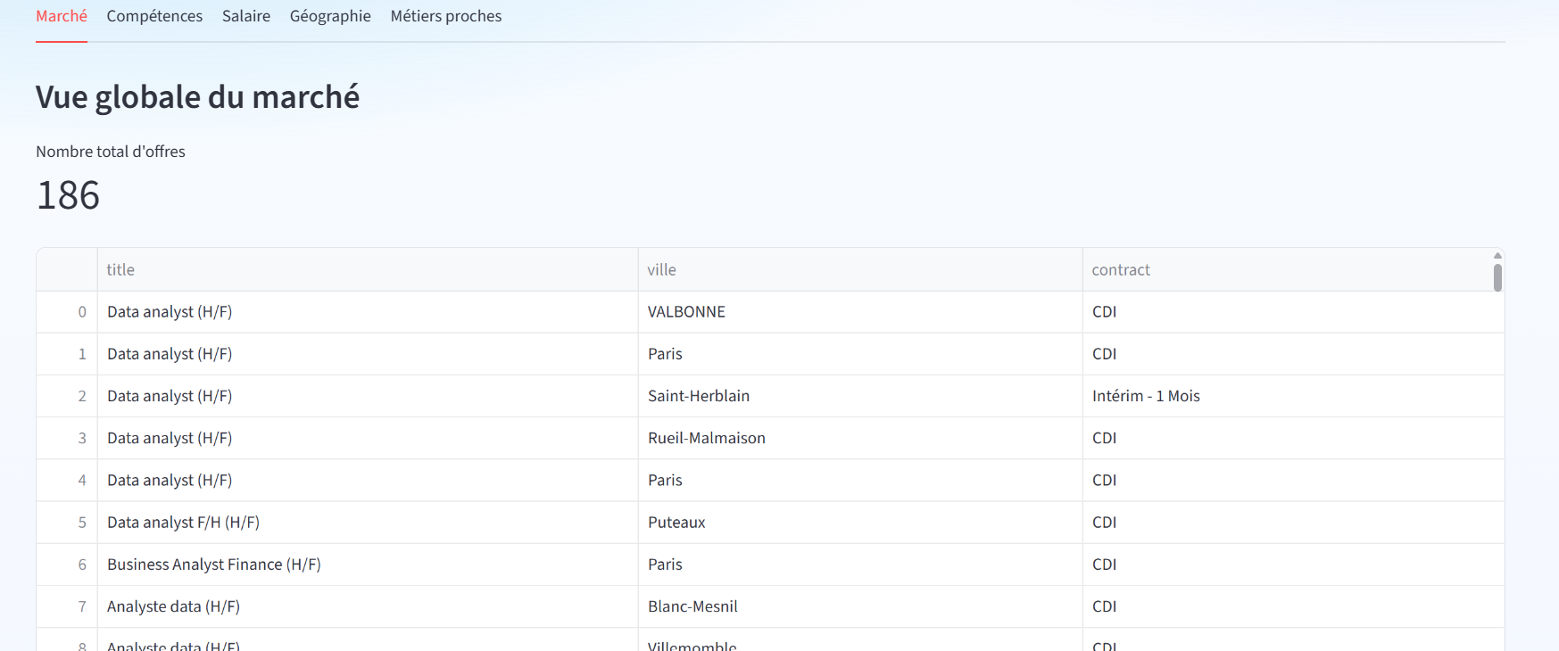 Affichage tabulaire des offres.